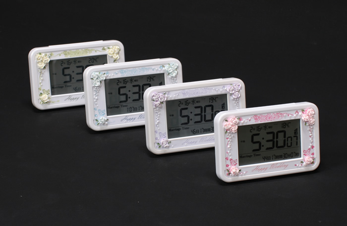 挙式アイテムとして使う場合は退場シーンの第一歩と合わせてスタートすることで本当の二人の時間が始まります。また、お二人の生まれた日時を入力すれば、育ててくれたご両親へ感謝をこめた記念グッズとしてご利用いただけます。さらに挙式予定日(未来時刻)をセットすると予定日までをカウントダウン表示することができます。